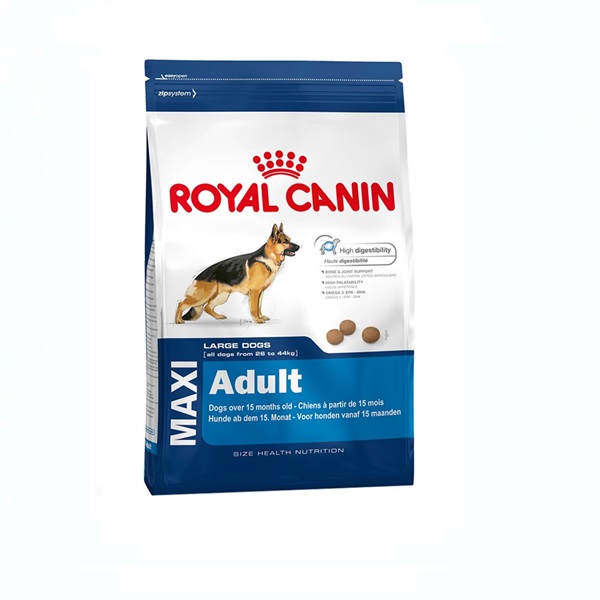 Thức ăn khô Royal Canin Maxi Adult là sản phẩm thức ăn cho các giống chó cỡ lớn trưởng thành từ 14 tháng tuổi đến 5 tuổi có trọng lượng từ 25 – 50 kg như : Rottweiler, Becgie, Alaska…..